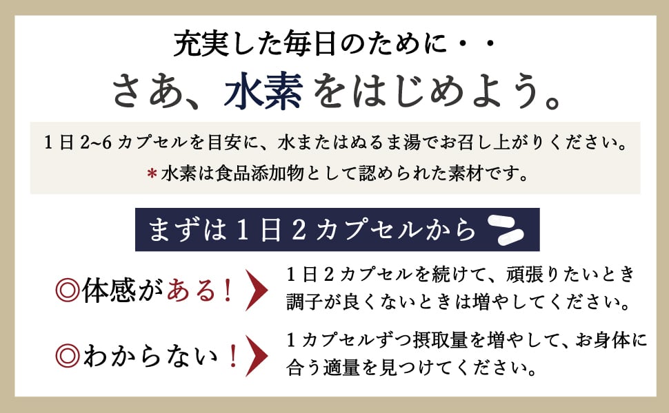 [お召し上がり方] 栄養補助食品として、1日当たり2~6カプセルを目安に、水またはぬるま湯でお召し上がりください。